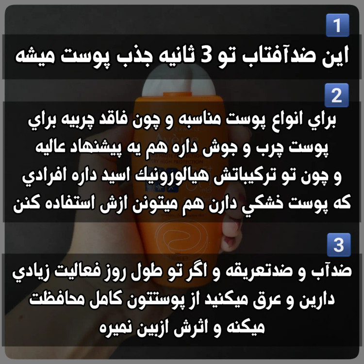 ✨️این ضدآفتاب ضدتعریق و ضدابه یعنی هرچقدر تو طول روز فعالیت داشته باشین و عرق کنید اثر این ضدآفتاب از بین نمیره بخاطر همین برای ورزشکاران مناسبه🚣♀️🚴🏻♀️🏄♀️🧗🏇