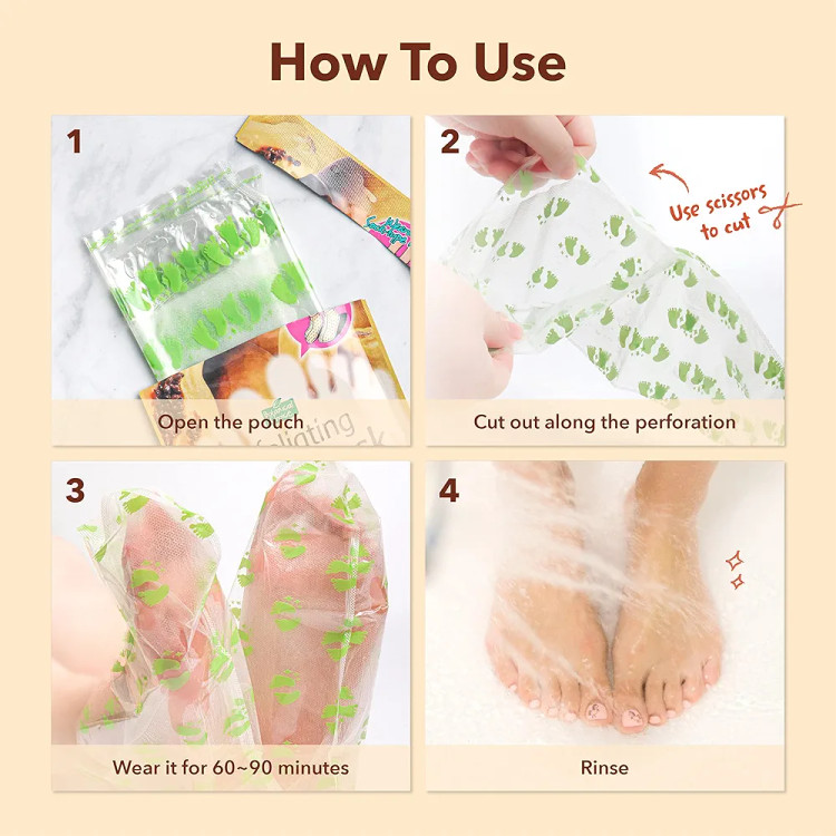۱. کیسه را باز کنید و ماسک لایه بردار کف پا را خارج کنید.