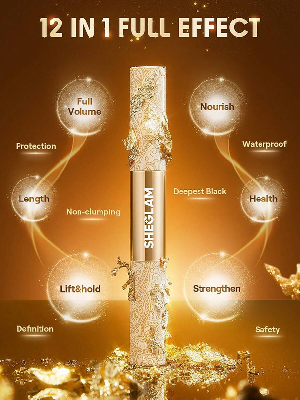 در تصاویر بالا میتوانید ریمل دوسر تقویتکننده طلایی SHEGLAM Double‑Ended Fortifying Mascara – Gold Edition را مشاهده کنید؛ با بدنهای طلایی و دو سری براش متفاوت که جلوهای لوکس و کاربردی دارد.