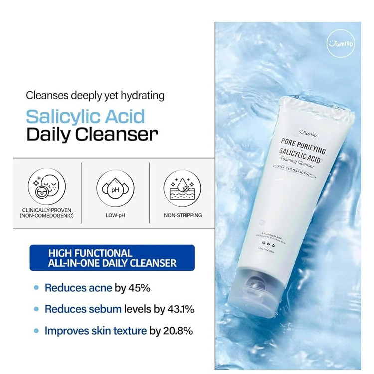 شوینده سالیسیلیک اسید جومیسو، فوم شستشوی صورت حاوی سالیسیلیک اسید است که برای انواع پوست بهویژه پوستهای چرب، مستعد جوش و مختلط مناسب است. این محصول به پاکسازی منافذ، لایهبرداری ملایم، کنترل چربی و کاهش جوشها کمک میکند. از دیگر ویژگیهای این شوینده میتوان به روشنکنندگی، آنتیاکسیدان بودن و pH پایین اشاره کرد.