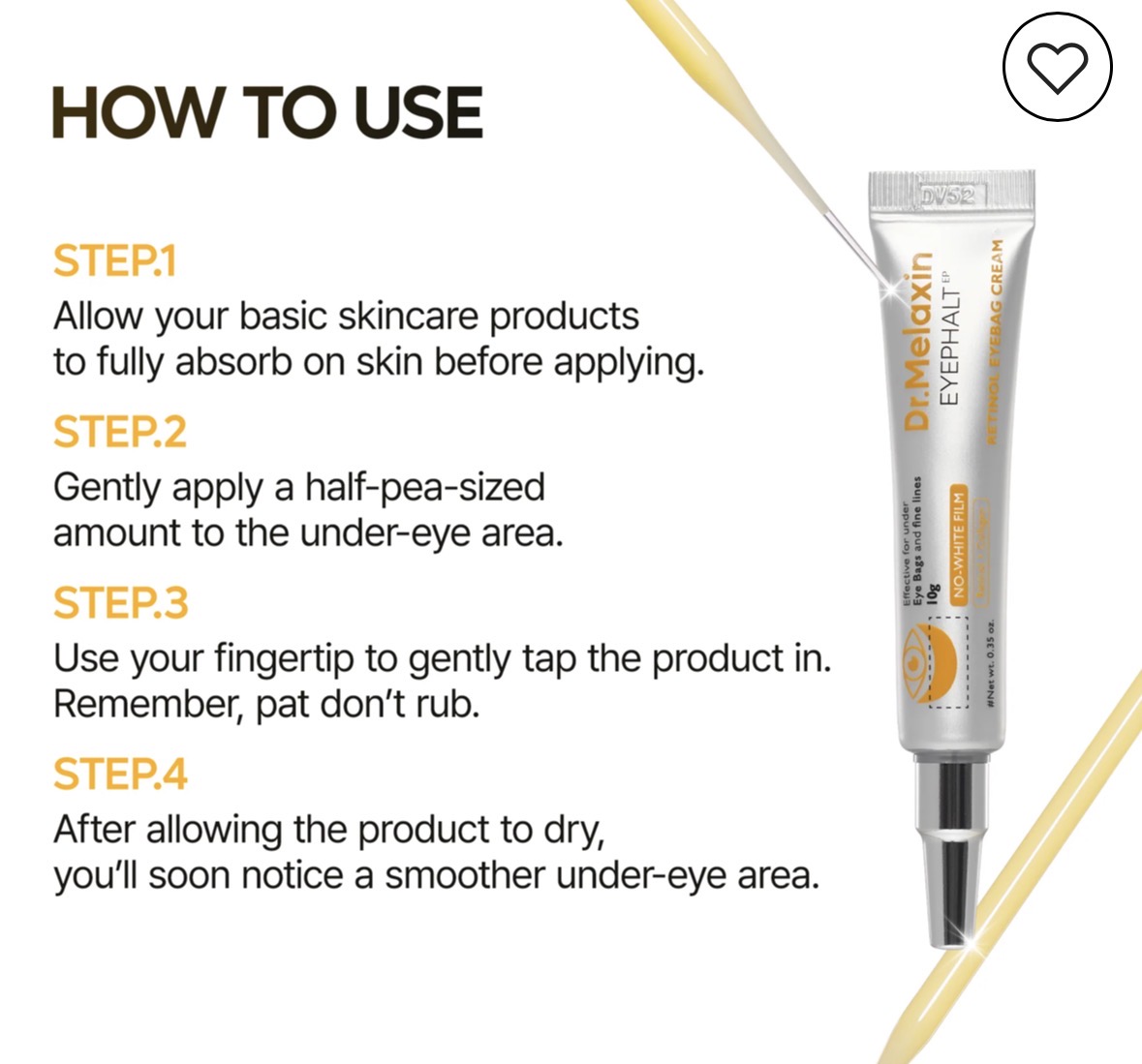 شبها مقدار بسیار کمی از کرم را روی پوست تمیز زیر چشم قرار داده و با ضربات ملایم پخش کنید تا جذب شود.